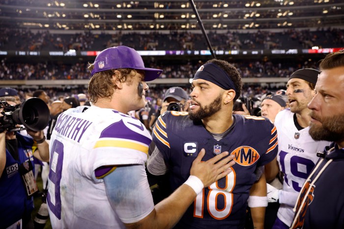 Minnesota Vikings quarterback J.J. McCarthy (left behind) as well as Chicago Bears quarterback Caleb Williams (best) welcome one another sticking to the computer game at Soldier Field onSept 8 inChicago