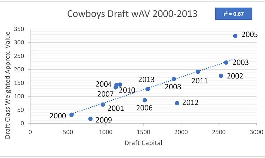 Throughout their background, draft resources has actually verified to be a trustworthy indicator of success. Evaluation of previous drafts making use of Weighted Approximate Worth (wAV) reveals a strong connection in between developed draft financing and the franchise business’s ability to prepare impactful gamers. Especially, a coefficient of 0. 67 recommends that worrying two-thirds of the Cowboys’ making up outcomes are gone over by the amount of resources invested.