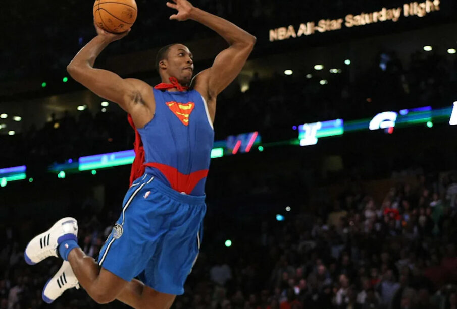 Dwight Howard of the Orlando Magic wearing a Superman cape in the Sprite Slam-Dunk Contest at the New Orleans Arena during the 2008 NBA All-Star Weekend February 16, 2008 in New Orleans, Louisiana.   AFP PHOTO    TIMOTHY A. CLARY (Photo by Timothy A. CLARY / AFP) (Photo by TIMOTHY A. CLARY/AFP via Getty Images)