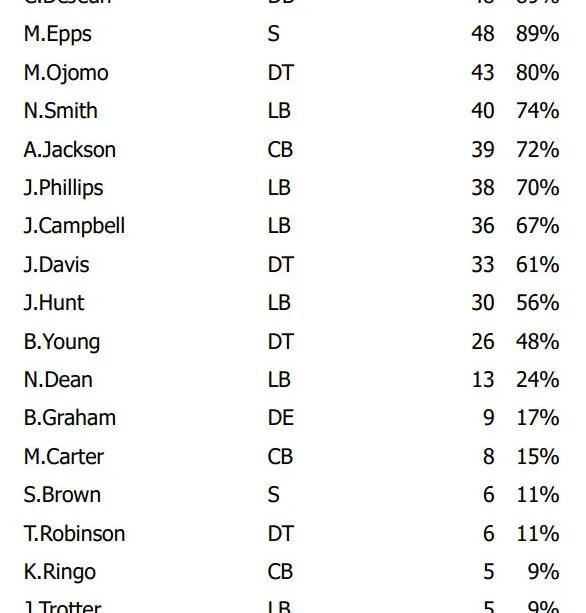 The safety line saw a healthy and balanced switching, with Moro Ojomo baiting 43 breaks (80 %), abided by by Jordan Davis (33 breaks, 61 %) and Byron Young (26 breaks, 48 %). The Eagles utilized their schedule deepness by allowing back-ups to get beneficial experience in the last element of the video game.