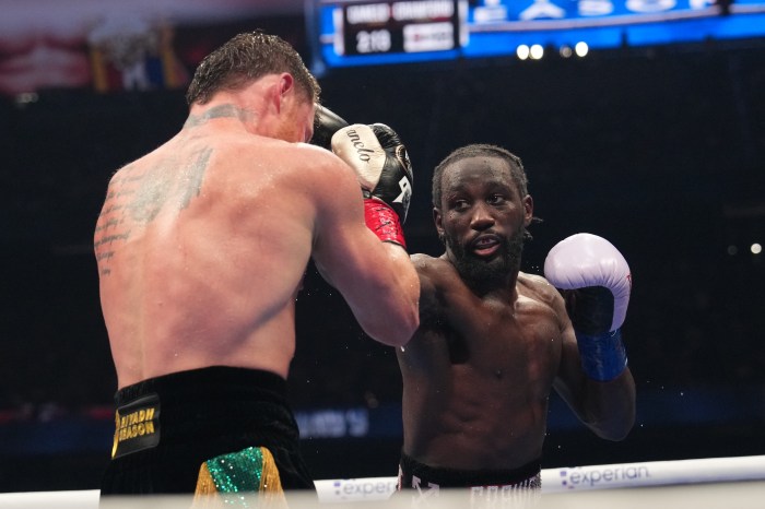 Boxer Terence Crawford (right) in the boxing ring against Canelo Álvarez.