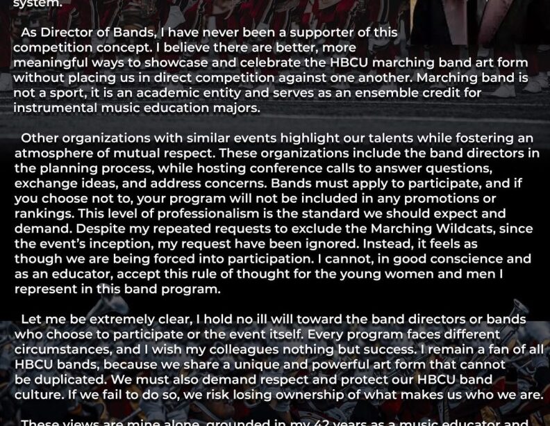 Wells’ statements have actually collected substantial focus on socials media, with lots of followers applauding his initiatives to protect the stability of HBCU culture in band competitors. The usual problems from both Wells and Little have actually boosted a larger discussion within the HBCU band location worrying commercialization and simply exactly how to truly commemorate the tradition of these programs. Wells has actually emphasized the value of unity and respect amongst band programs while sustaining for the preservation of their social worth. As the discussion advances, it remains focused on uncovering much much better suggests to memorialize and identify HBCU marching bands past affordable positions.