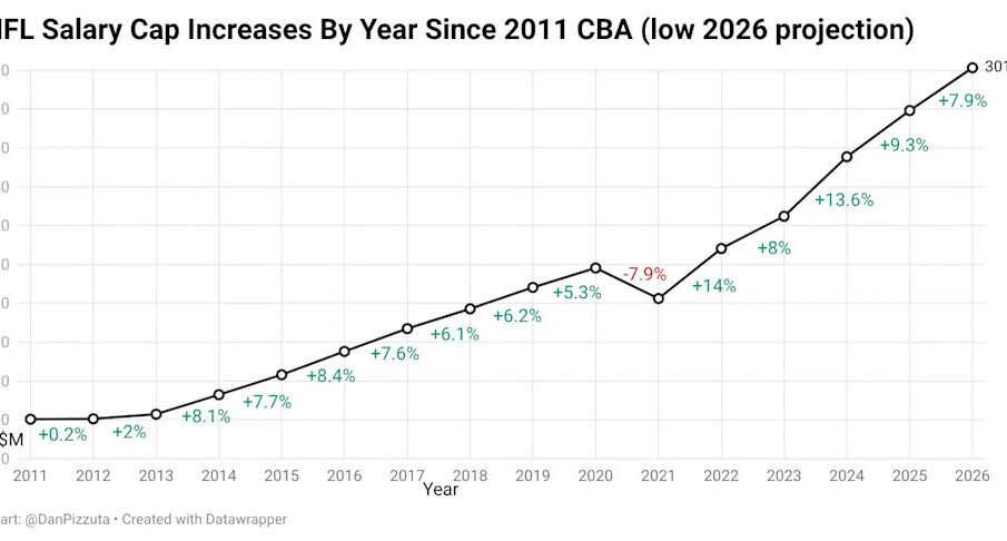 According to NFL Network’s Tom Pelissero, the income cap for 2026 is approximated to decrease in between $ 301 2 million and $ 305 7 million per group. This keeps in mind a substantial surge from the here and now cap of $ 279 2 million, a rise of around 7 9 % to 9 5 %. Over the previous 5 years, the cap has in fact recoiled extremely, redeeming from a dip as a result of the Covid- 19 pandemic, and expanding by more than $ 100 million.