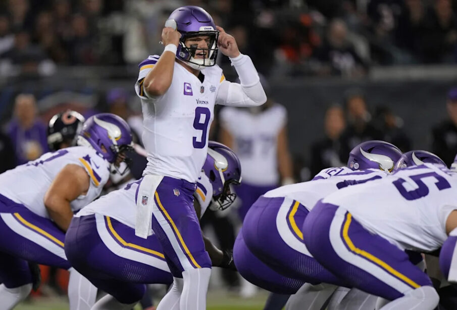 Minnesota Vikings quarterback J.J. McCarthy (9) talks to teammates during the first half of an NFL football game against the Chicago Bears in Chicago, Monday, Sept. 8, 2025. (AP Photo/Nam Y. Huh)
